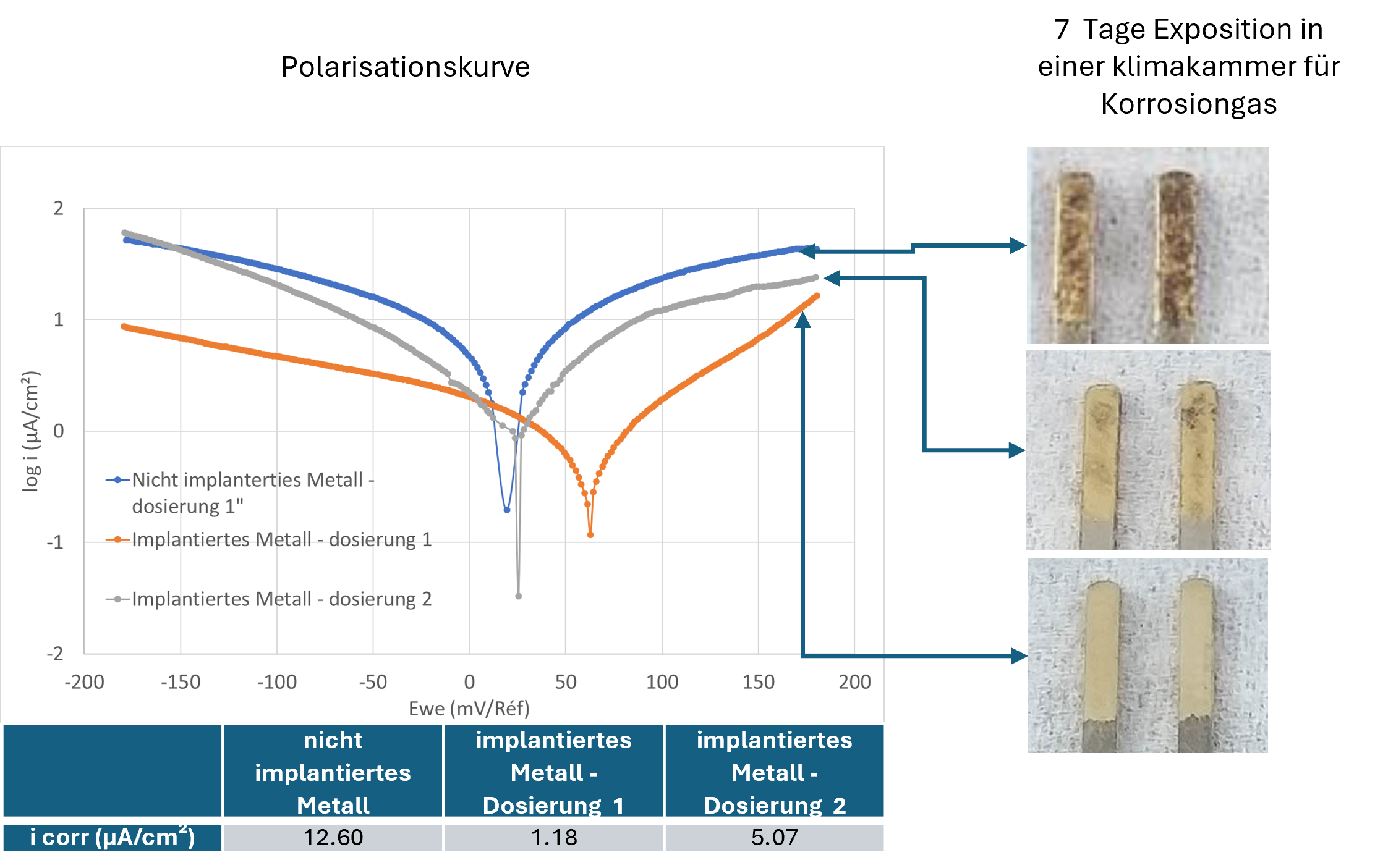 Die Messungen der Polarisationskurven und ihre Korrelation mit einem Alterungstest mit korrosiven Gasen ermöglichten die Optimierung der Implantationsparameter und zeigten die signifikante Erhöhung der Korrosionsbeständigkeit des implantierten Metalls. Die elektrochemische Technik ermöglicht es, die Implantationsbedingungen zu diskriminieren.