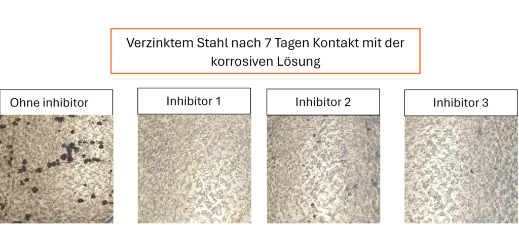 Wenn kein Inhibitor vorhanden ist, sind die Rp-Werte niedrig und nehmen mit der Zeit ab. Der verzinkte Stahl zeigt am Ende des Tests zahlreiche Korrosionsstellen.