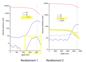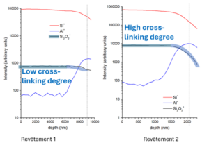 Um zu erklären, warum die Beschichtung 1 widerstandsfähiger ist, werden ToF-SIMS-Profilanalysen von der Oberfläche der Beschichtung bis zum Aluminiumsubstrat durchgeführt. Beschichtung 1 ist ein reines Metalloxid (SiO2); Beschichtung 2 enthält zusätzlich organische Gruppen (R).