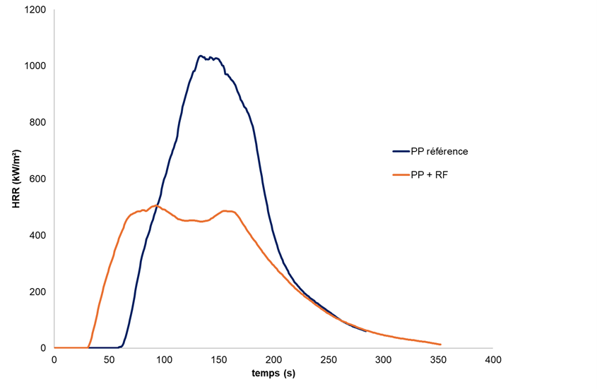 Für eine korrekte Bewertung sollten die Flammschutzmittel zunächst in Polypropylen (PP) eingebaut werden, einem Polymer mit geringem Brandverhalten. MATERIA NOVA stellte die PP/BioRF-Mischungen schmelztechnisch in einem internen Mischer her, formte die Platten durch Thermokompression und führte die Brandtests mit dem Mass Loss Cone Calorimeter (MLC) durch.