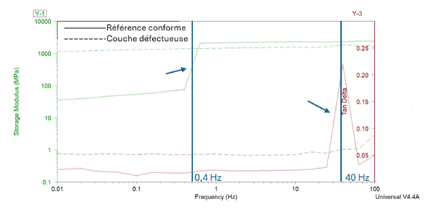 Die wichtigste Schlussfolgerung ist, dass die Folien unterschiedliche mechanische und viskoelastische Eigenschaften haben: Die fehlerhafte Folie ist über den gesamten Beanspruchungsbereich sehr steif, im Gegensatz zur konformen Folie, die weicher ist und bei einer bestimmten Frequenz ein viskoses Phänomen aufweist. Dies erklärt also die Nichtkonformitäten, die bei der beim Kunden durchgeführten Qualitätskontrolle festgestellt wurden.