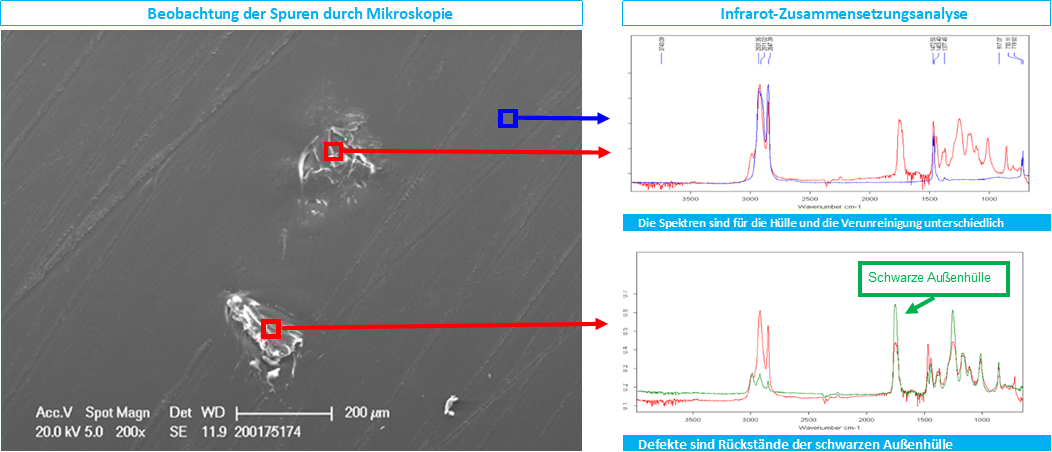 Mithilfe der Rasterelektronenmikroskopie (REM), die mit der FTIR-Spektroskopie gekoppelt war, konnte die Zusammensetzung dieser Verunreinigung eindeutig identifiziert werden.