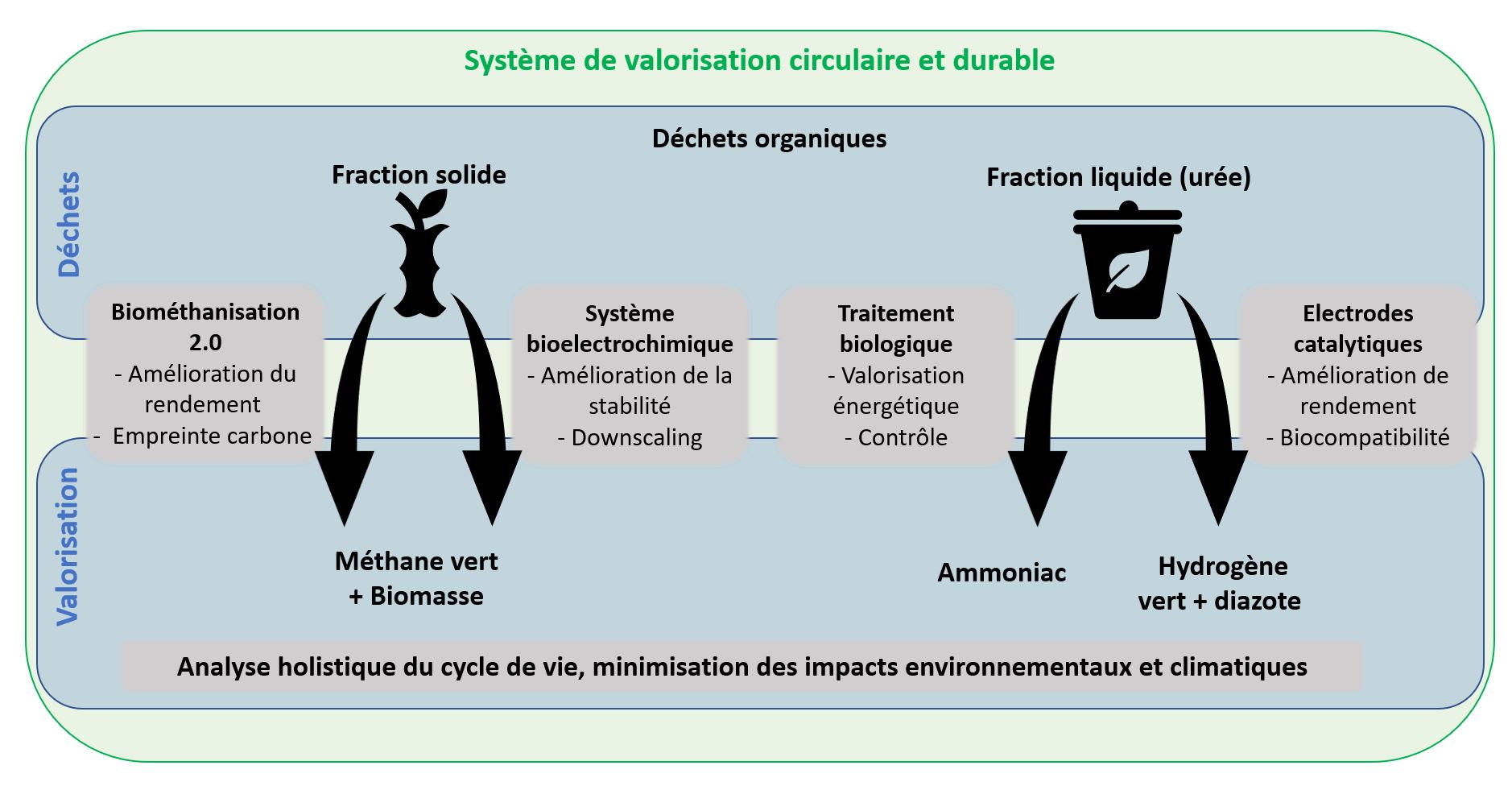 Verbesserung der energetischen Verwertung organischer Abfälle zur Erzeugung von Biomethan und grünem Wasserstoff aus Urin und Lebensmittelabfällen durch die Entwicklung neuer Elektrodenmaterialien, innovativer bioelektrochemischer Systeme und die Verringerung der gesamten Umweltauswirkungen.