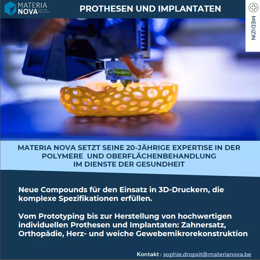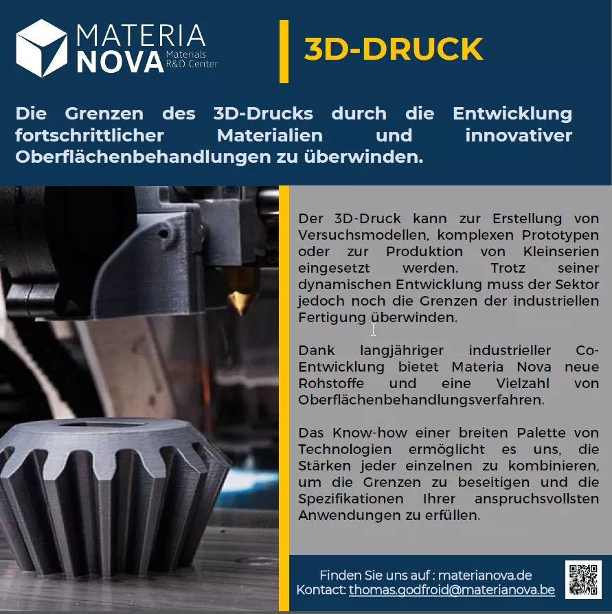 Materia Nova bewertet deren Druckfähigkeit, optimiert die Druckbedingungen und die Schnittstellen zwischen Schichten und Materialien, um die gewünschten Eigenschaften zu erreichen.