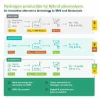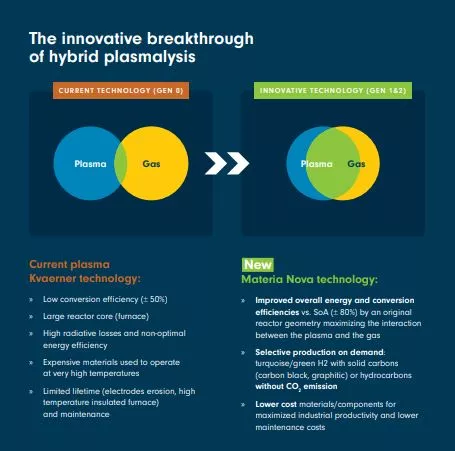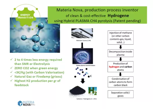 - Materia Nova investiert seit vielen Jahren in die Forschung und Entwicklung von sauberen Verfahren zur Herstellung von grünem Wasserstoff. Im Oktober 2020 meldeten wir ein Patent zur Optimierung des Verfahrens und der Ausrüstung für das Cracken von Methan (Gruben- und Biogas) mit dem HYBRID PLASMALYSIS-Verfahren an, das „türkisfarbenen“ Wasserstoff und Ruß erzeugt. (CH4=> C + H2).