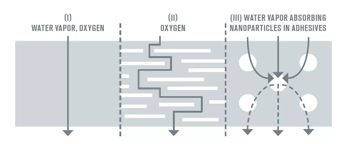 - Multidisziplinärer Ansatz, der additivierte Polymerschichten mit Nanopartikeln, Gettern und Scavengern, dichten Metalloxidschichten verbindet.