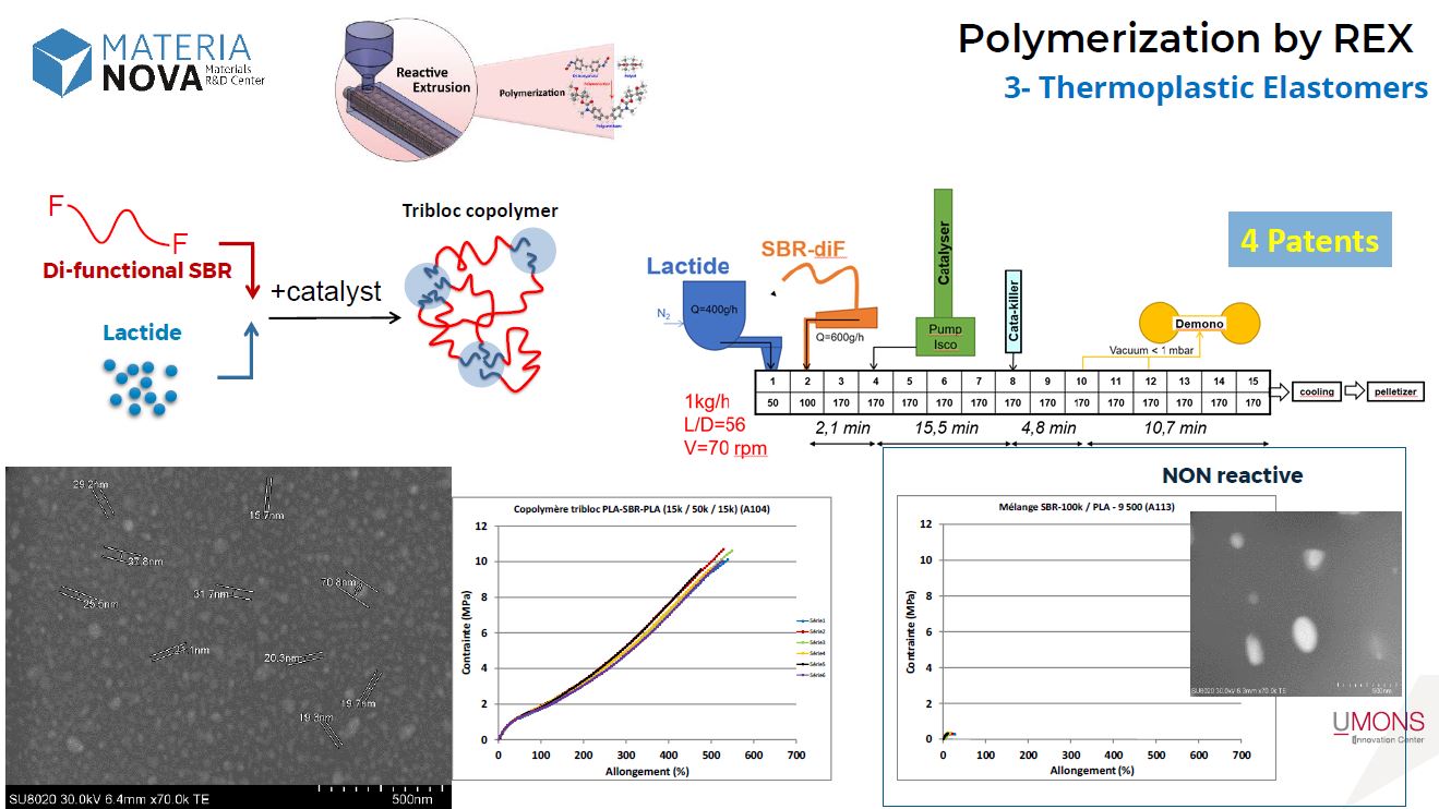 Im Laufe der verschiedenen Entwicklungsprojekte hat Materia Nova solide Kenntnisse in der Modifizierung, Synthese und Polymerisation von Biopolymeren durch Reaktive Extrusion (REX) erworben, die es ermöglichen, neue biobasierte Materialien (Plyester, NIPUs und Elastomere) zu entwickeln, sie zu funktionalisieren und kompatibel zu machen.