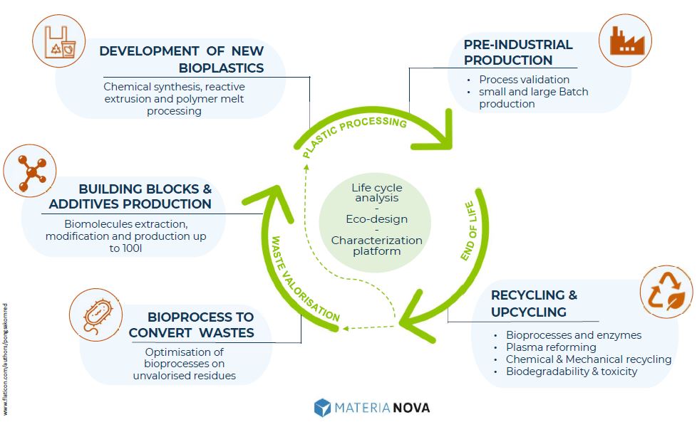 - Materia Nova ist in der Lage, alle Stufen der Entwicklung dieser Biomaterialien abzudecken. Von der Gewinnung und Entwicklung der Bio-Building Blocks bis zur Entwicklung des Biopolymers, seiner chemischen Modifikation und Formulierung.