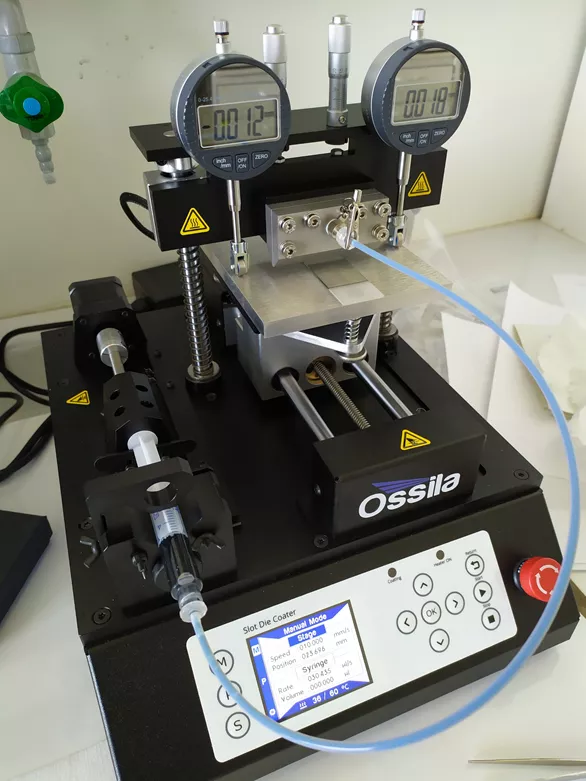 Slot-Die-Abscheidungssystem im Labormaßstab für Beschichtungen von (10 cm x 5 cm), das mit groß angelegten Herstellungsverfahren wie Roll-to-Roll (R2R) und Sheet-to-Sheet (S2S) kompatibler ist.