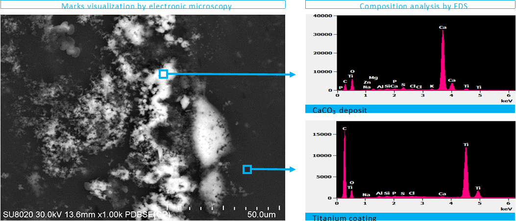 Firstly, the analyses showed that it was a deposit and not a degradation. Secondly, the deposit was nothing more than a residue of limestone on top of the titanium coating, which remained intact.