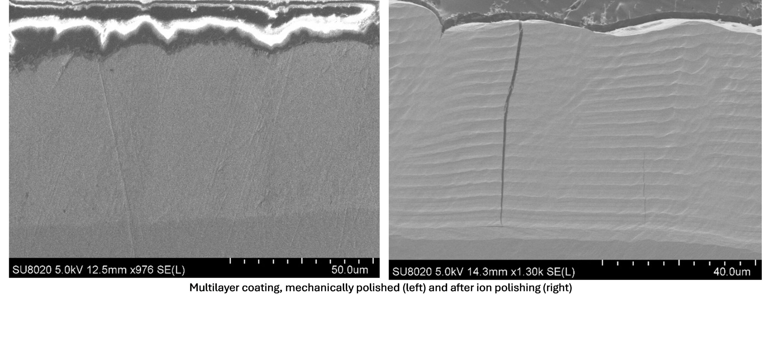 In addition to analyzing surface topography, the SEM can be used to characterize the structure of materials in depth, coatings or multilayers, using cross-sections. In this case, preparation by polishing the surface of the cross-section is crucial.