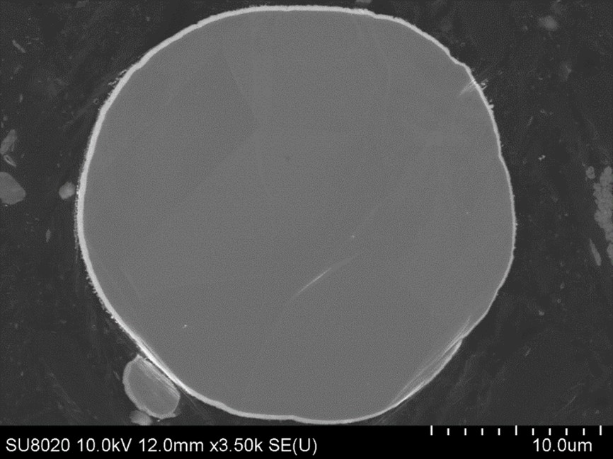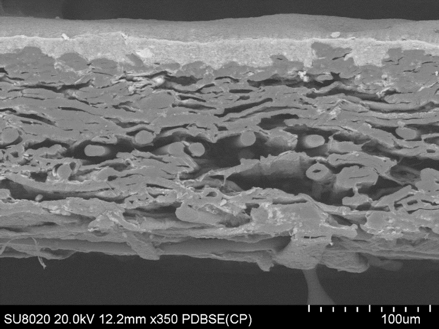 On the sample of non-woven textile below, the cross-section obtained after ion polishing clearly shows the natural (flatter) and synthetic (circular cross-section) fibers, as well as the surface impregnation by the polymer coating..