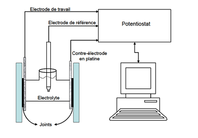 In practice, metal samples are brought into contact with a corrosive solution. The experimental set-up consists of a 3-electrode electrochemical cell. This comprises the working electrode, which is the material to be analyzed, a reference electrode to control the potential of the working electrode, and a counter-electrode to close the circuit. The cell is filled with the chosen corrosive solution.