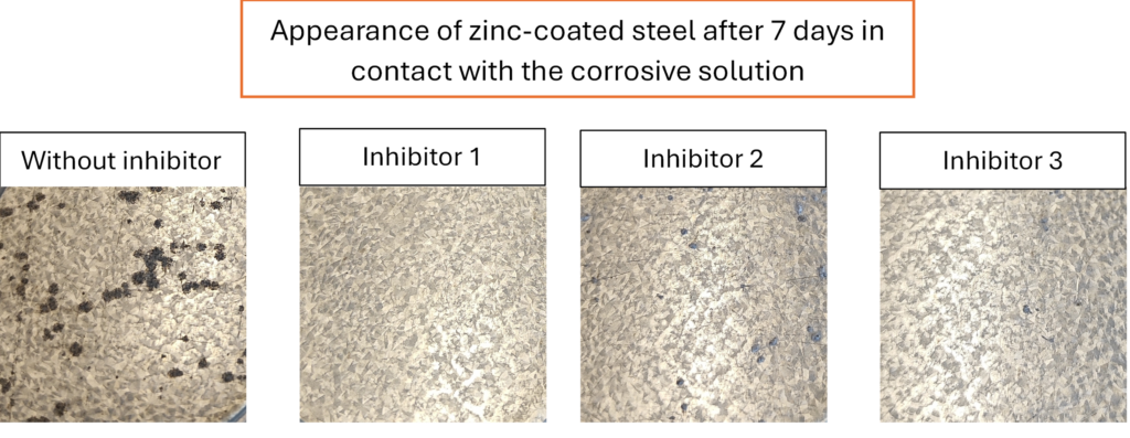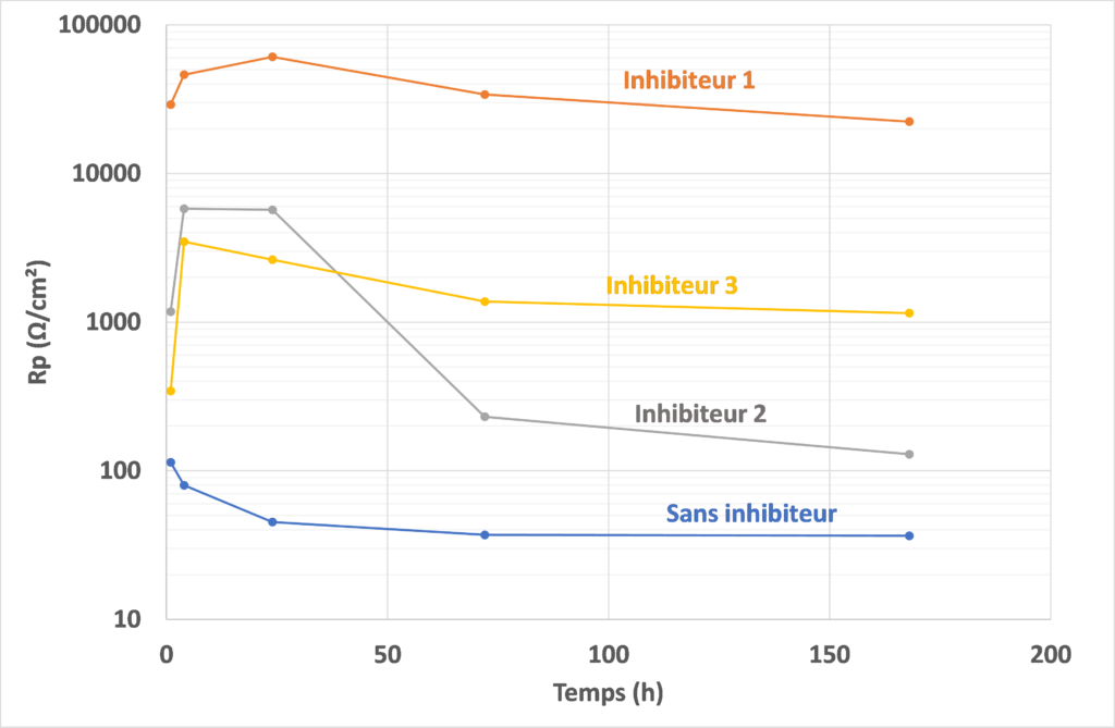 In the presence of inhibitor 1, Rp values are very high from the outset and remain so over time. The excellent protection provided by this compound is confirmed by its surface condition at the end of the test: no signs of corrosion are visible. Inhibitors 2 and 3 provide less protection than the former. Compound 2 is effective for up to 24 hours, after which the Rp value falls sharply, showing the loss of the protection initially provided. Zinc-coated steel shows numerous corrosion spots at the end of the test, but in lesser quantities than without inhibitor. Finally, compound 3 shows lower Rp values than compound 1, but these are maintained over time. This shows that the protection provided is maintained, with zinc-coated steel showing only a few spots of corrosion.