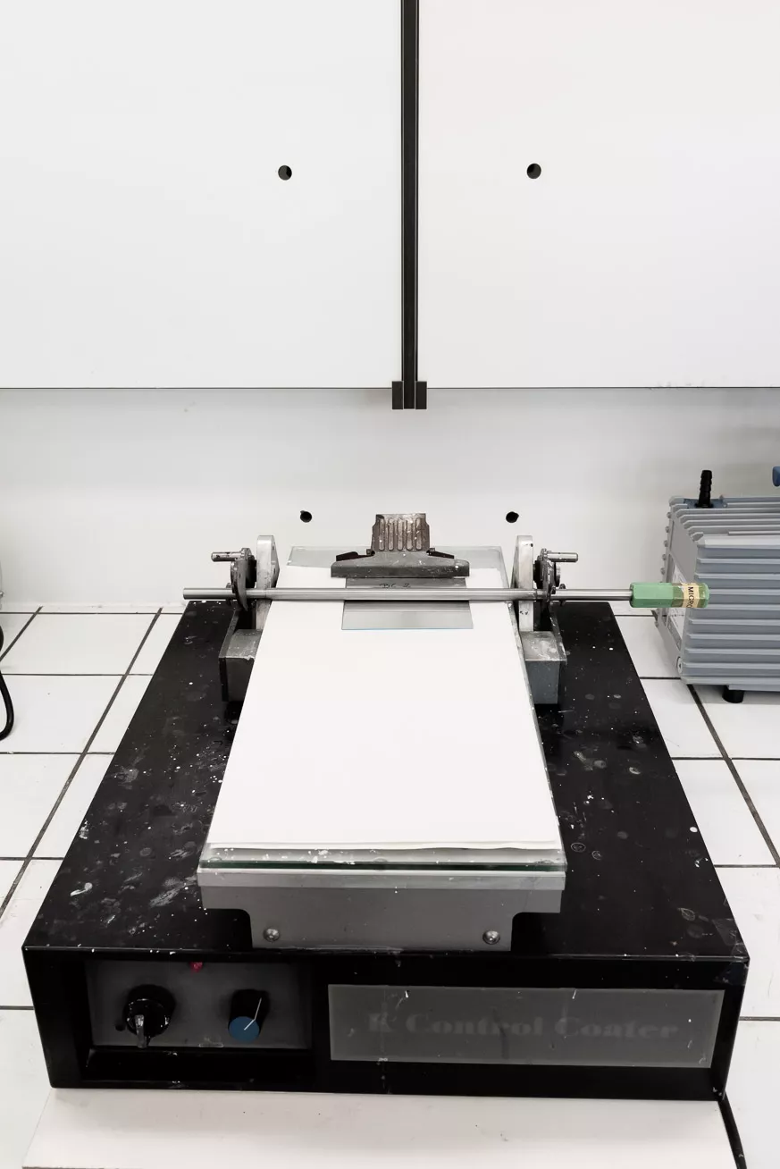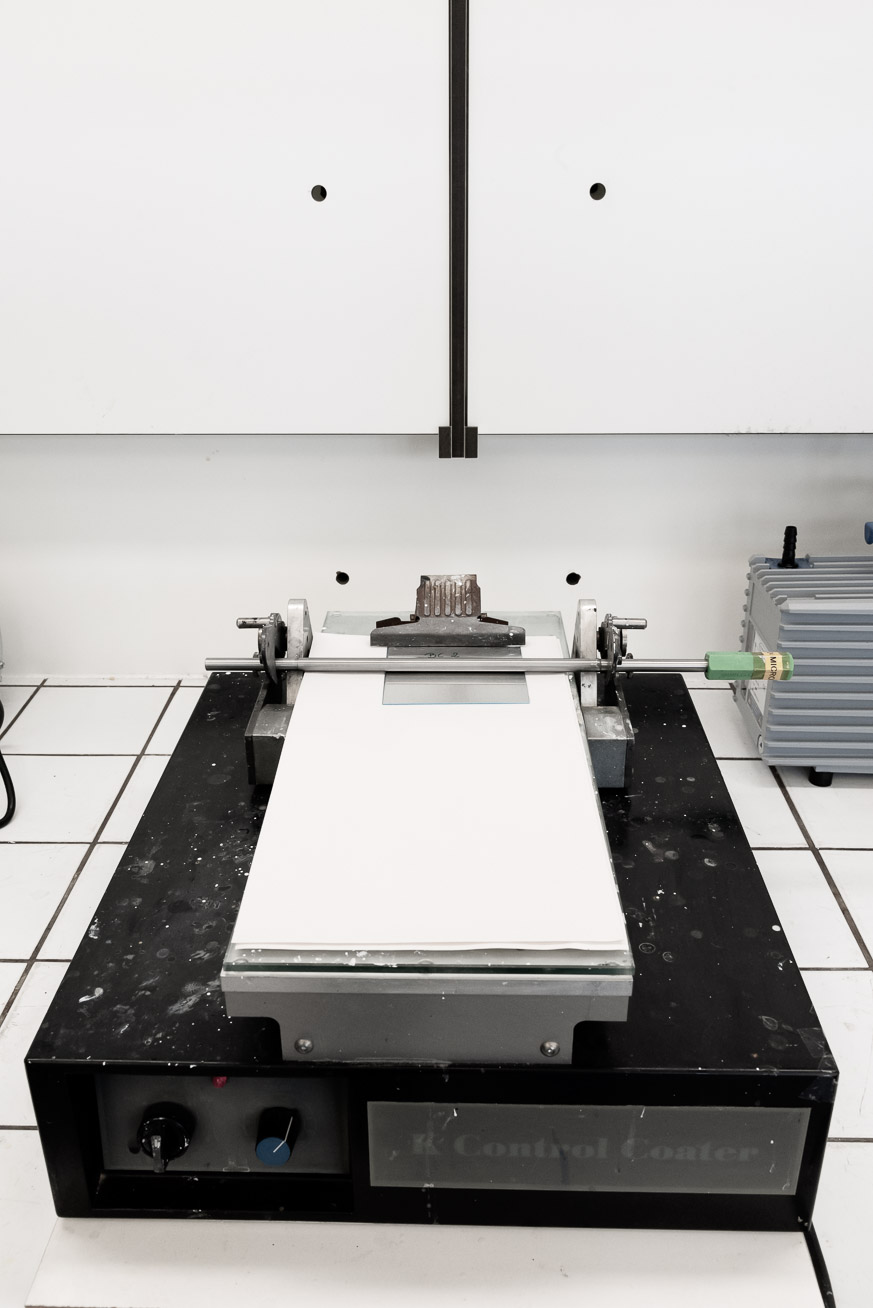 This device automatically applies paint, varnish, ...... of uniform thickness and aspect, at constant speed on various substrates (metal plates, glass plates, paper sheets, ....).