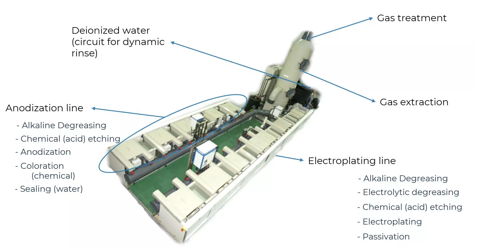 This line consists of a metal deposition treatment line (Zn, Ni, ...) on metal substrates and an aluminum anodizing line.