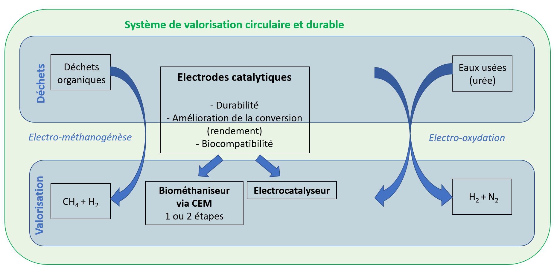 Improve the energy recovery of organic waste to produce biomethane and green hydrogen from fermentable organic matter and urine by developing new electrode materials, innovative electrical stimulation of bacterial consortia and reducing the overall environmental impact.
