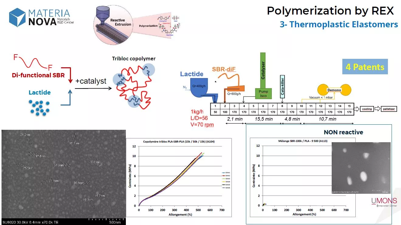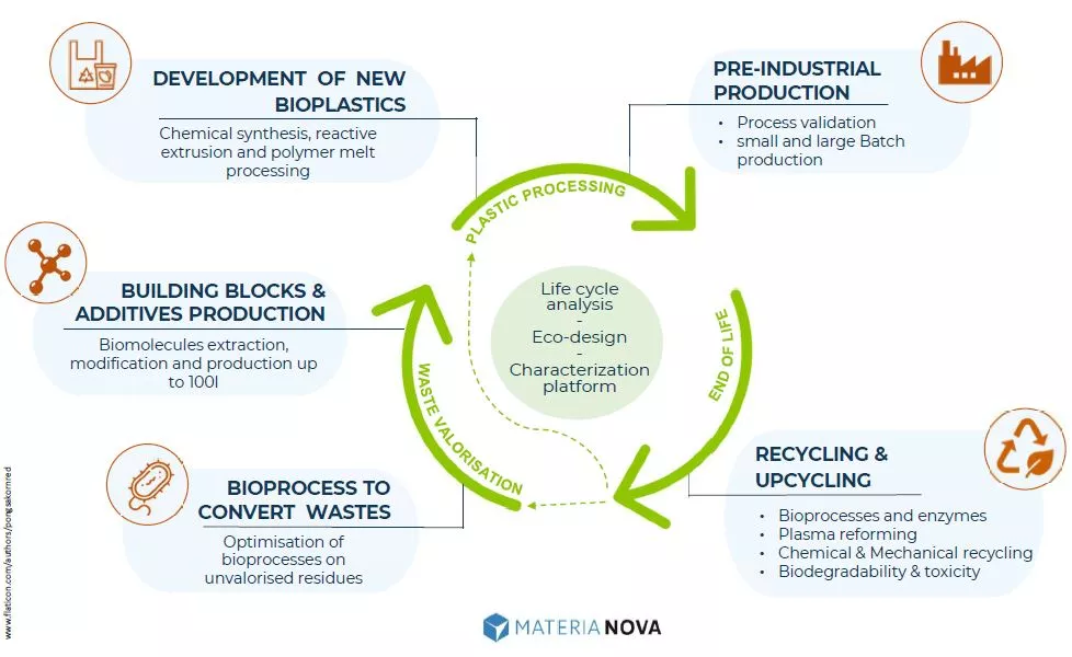 - Materia Nova is able to cover all stages of development of these biomaterials. From the extraction and development of bio-building blocks to the development of the biopolymer, its chemical modification and formulation.