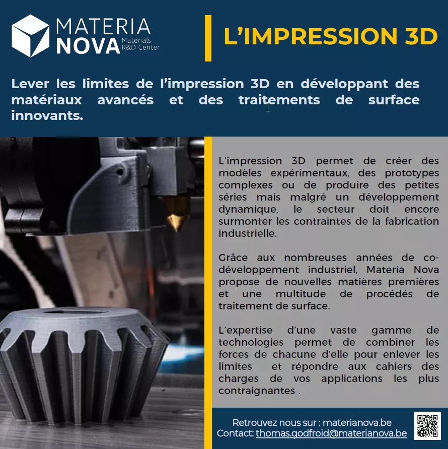 Materia Nova evaluates their printability, optimizes the printing conditions and the interfaces between layers and materials in order to achieve the desired properties.