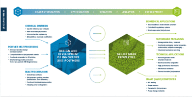 In some cases, the properties of (bio)polymers do not meet the technical specifications of the targeted applications, and the additive route (extrusion) does not allow this gap to be bridged. It therefore becomes necessary to chemically modify these (bio)polymers, by grafting or chain extension for example, in order to adapt their properties (water resistance, foamability, increased ductility, etc.).