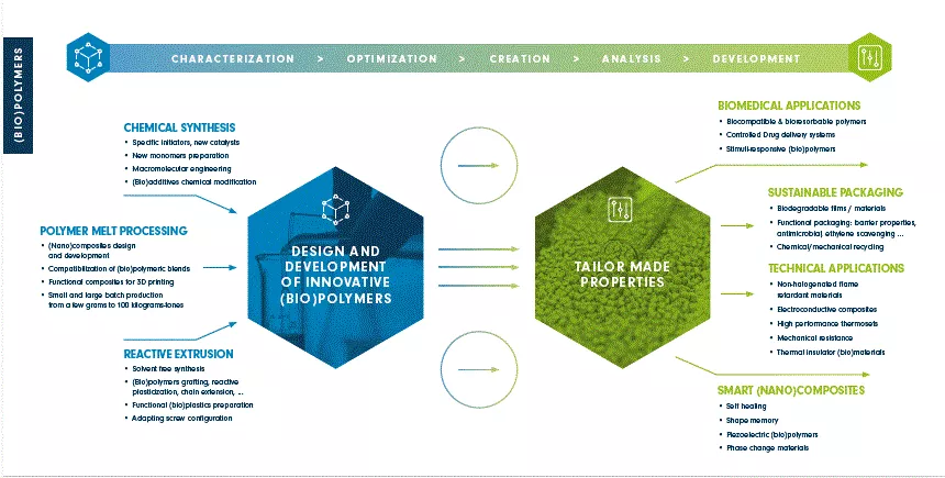 Materia Nova has solid expertise in the development of custom (bio)polymers. The properties of these (bio)polymers can be optimised and improved according to the specifications provided by the partner, whether by reactive or additive means. What's more, with its range of analyses and characterisations covering structural, thermal, morphological, mechanical, biodegradation, bioresorption and fire properties, Materia Nova can cover the entire development chain for composites with one or more properties.