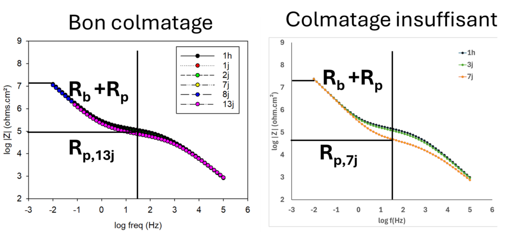 Le module de l’impédance à basse fréquence renseigne sur la résistance à la corrosion de l’aluminium anodisé et colmaté. Plus sa valeur est élevée, plus la résistance à la corrosion est importante. Les spectres d’impédance illustrés ici montrent la réponse d’aluminium anodisé et correctement ou insuffisamment colmatés. Dans le premier cas, la contribution résistive de la couche poreuse (fréquences intermédiaires) se maintient à 105 Ohms.cm² jusqu’à 13 jours de contact avec la solution agressive. Si le colmatage est insuffisant, la résistance de la couche poreuse diminue au cours du temps comme illustré ici. En utilisant un logiciel adapté, il est possible d’analyser plus finement l’évolution des paramètres caractérisant les couches barrière et poreuse. La détermination de la capacité de la couche barrière permet d’estimer son épaisseur en vertu de la relation qui lie la capacité d’un condensateur à l’épaisseur et la constante diélectrique du matériau (connue pour l’alumine). Par exemple, dans le cas traité, l’épaisseur de la couche barrière est de 17 nm.