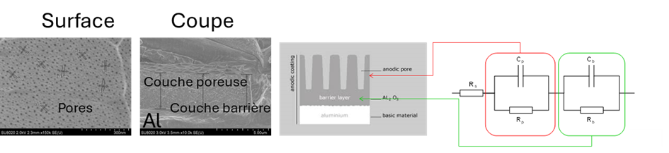 La technique EIS a permis de mettre en évidence, dans un temps relativement court, la qualité du colmatage de la couche d’anodisation poreuse de l’aluminium 1050 et de déterminer l’épaisseur de la couche barrière. Les examens MEB complémentaires permettent l’observation de surface des échantillons et d’analyser leur porosité (taille moyenne des pores, densité) en utilisant des techniques d’analyse d’image adaptées. L’utilisation d’une technique de cryofracture permet l’obtention rapide de l’épaisseur mais également un examen morphologique en coupe.