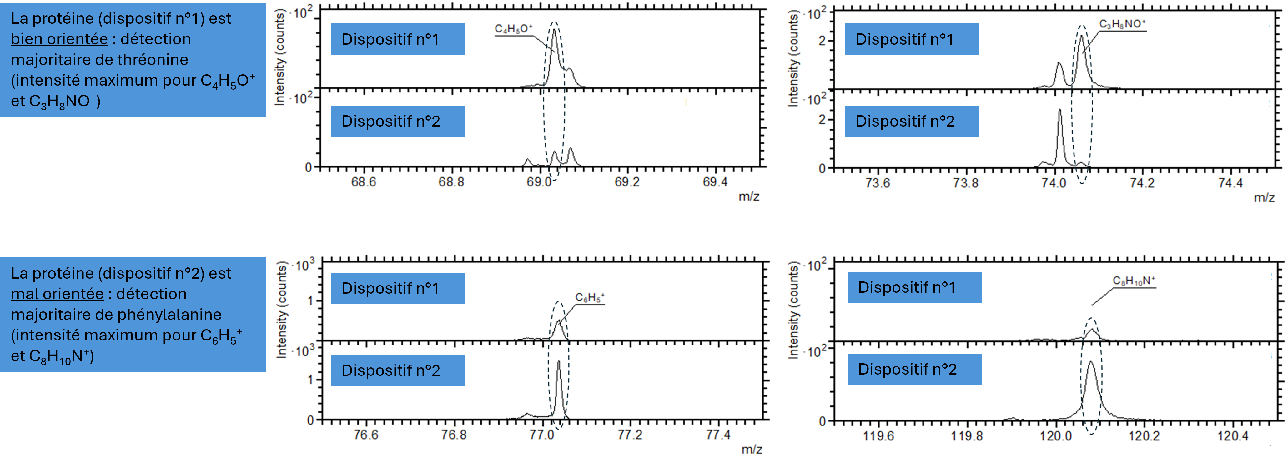 Le ToF-SIMS, grâce à l’information moléculaire et la haute résolution en masse permet de déterminer quels acides aminés de la protéine sont principalement présents en surface.