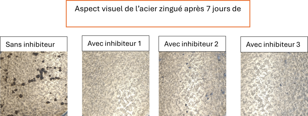 En l’absence d’inhibiteur, les valeurs de Rp sont faibles et diminuent avec le temps. L’acier zingué montre de nombreux points de corrosion en fin de test.