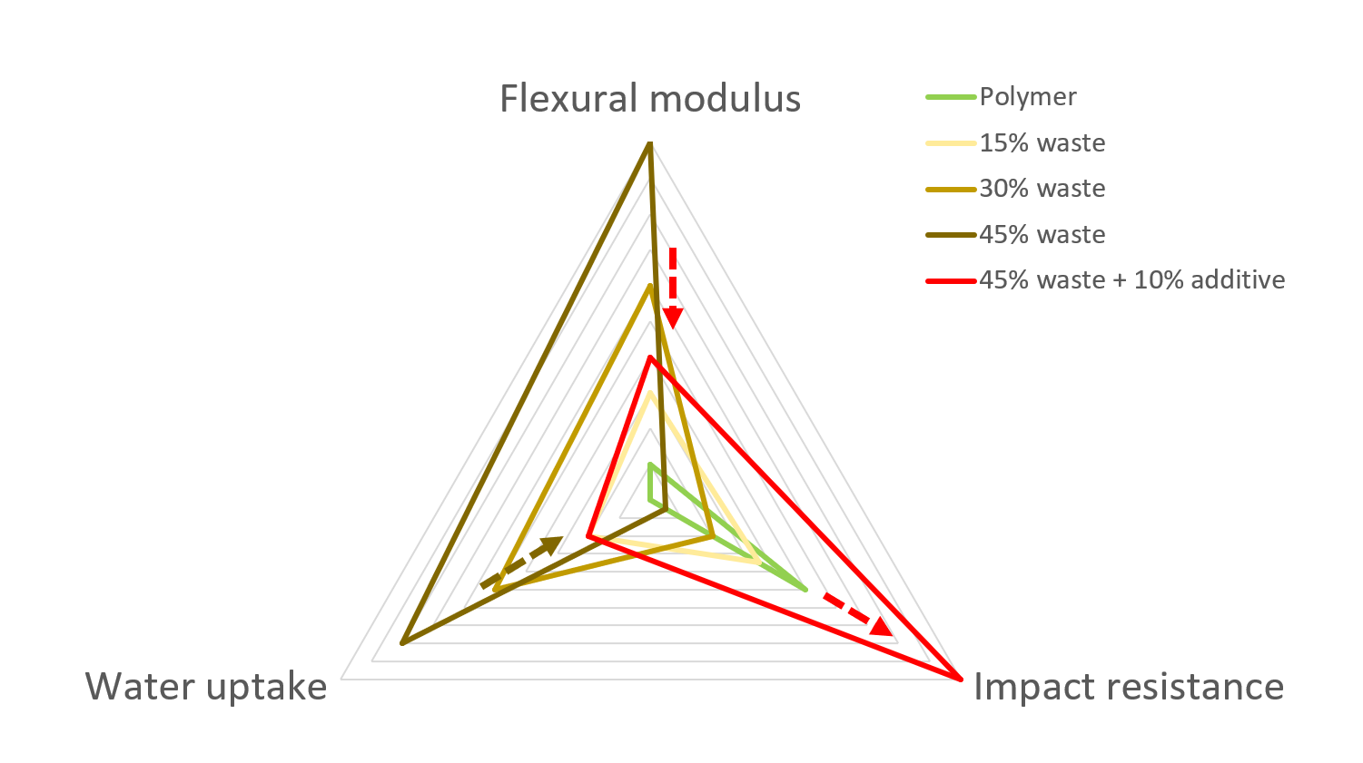 Par l’ajout d’additifs commercialement disponibles, il est possible d’introduire de forts taux de déchets organiques, tout en maintenant ou améliorant les propriétés du polymère de départ.