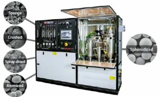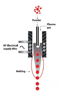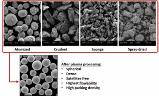 Elle permet la transformation soit de poudres agglomérées produites par des techniques de séchage par pulvérisation ou de frittage, soit de poudres angulaires produites par des méthodes de concassage conventionnelles, en poudre sphérique. La densification et la sphéroïdisation des poudres sont une application largement acceptée de la technologie du plasma par induction. Il s’agit essentiellement du chauffage et de la fusion en vol de la matière première, suivis de son refroidissement et de sa solidification ultérieurs dans des conditions contrôlées.