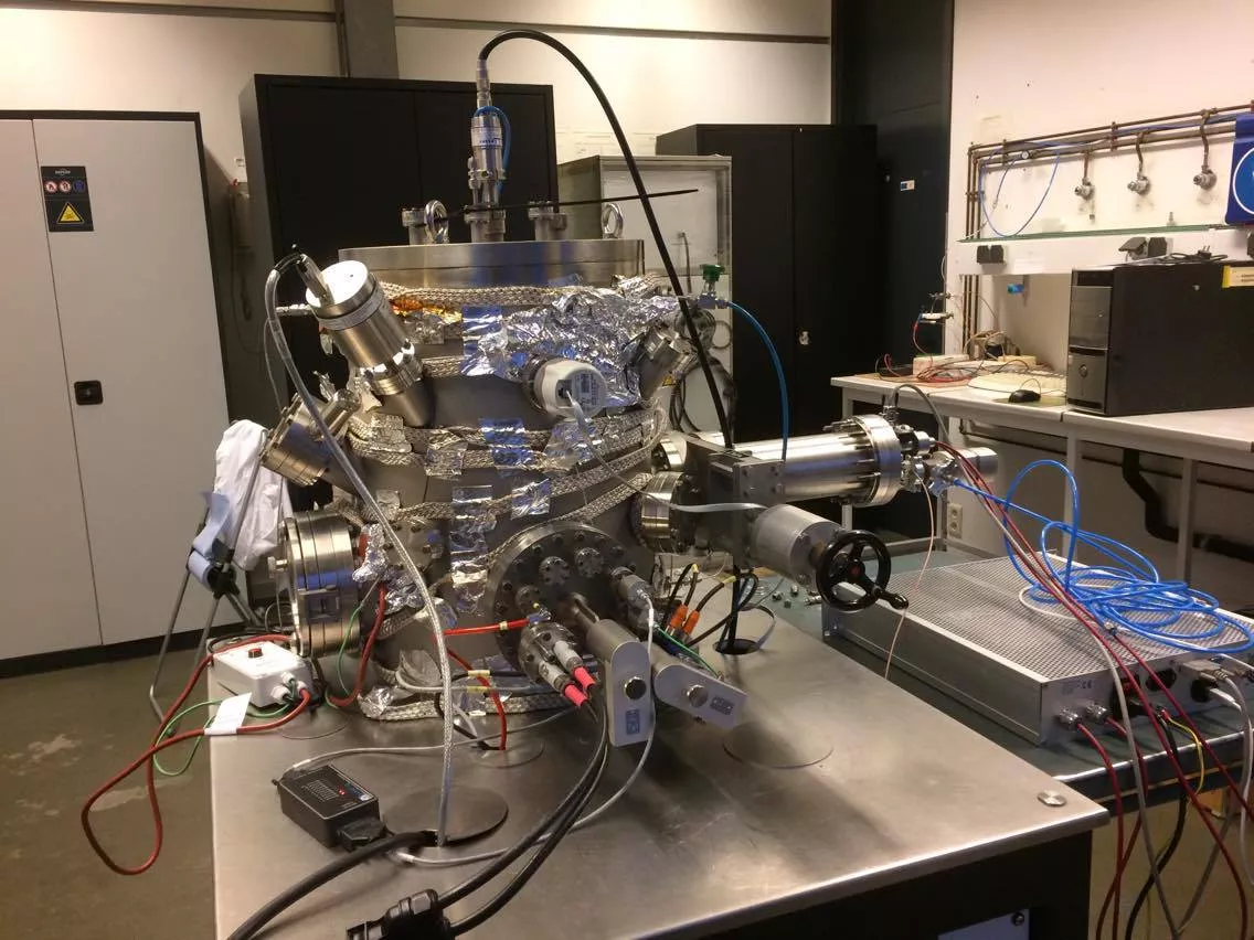 Cette enceinte permet de coupler la pulvérisation magnétron au GLAD (glancing angle deposition) c’est-à-dire d’avoir un substrat mobile suivant deux axes de rotation : inclinaison et rotation du substrat. Possibilité d’obtenir des films très poreux et nanostructurés en colonnes inclinées, colonnes verticales, zigzags, hélices. Possibilité de cristalliser les films in situ. Idéal pour les applications de cellule solaire et de photocatalyse qui demandent des films mince avec une large surface spécifique. Un implanteur ionique est également connecté sur cette enceinte, permettant de modifier la surface et la composition chimique des couches nanostructurés par dopage. La pulvérisation magnétron statique ou en angle rasant et l'implantation ionique peuvent donc être couplés sur cet équipement.