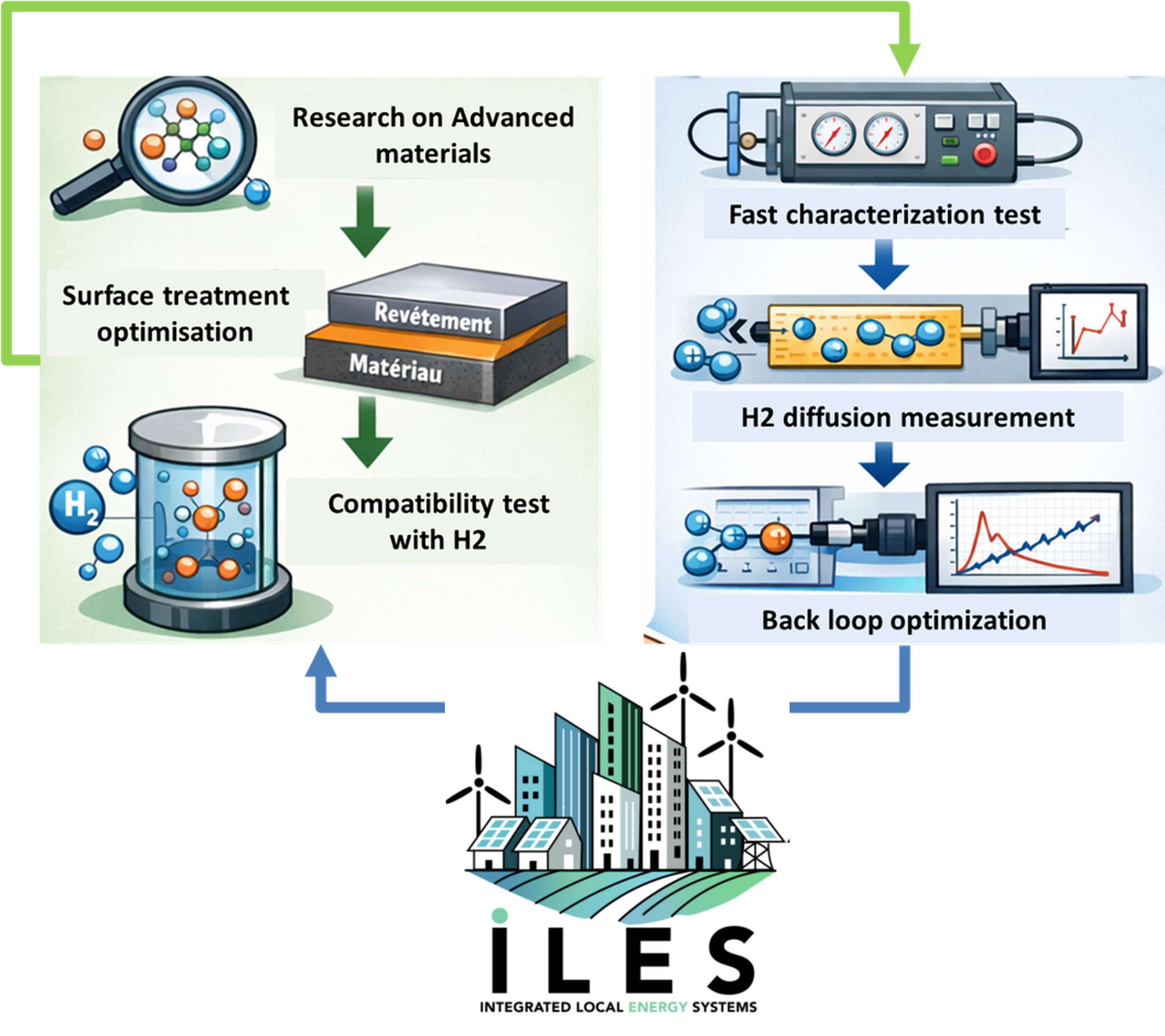 ILES – Axe 3 prévoit de démontrer des solutions de barrière à l’hydrogène sur des composants d’installations réels, en particulier des structures creuses, afin de prouver la faisabilité des applications de rénovation. Le projet inclut également la mise en place d’un système de caractérisation rapide pour évaluer les propriétés de barrière à l’hydrogène de différents matériaux.