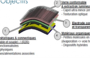 La recherche a pour objectif le développement de systèmes d’éclairage surfacique (rigide, court ou flexible) très performants grâce à la technologie OLED intégrée sur supports métalliques ou alliage dont cuivre électrodéposé, conformables.