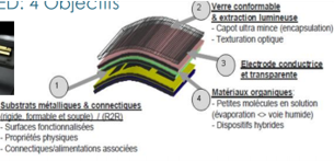 L’objectif de ce projet OLED est résolument orienté vers le développement de produits tenant compte des contraintes industrielles liées aux demandes du marché et des clients selon 4 sous-objectifs de composants :