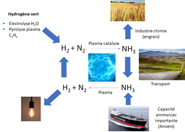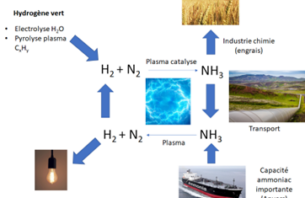 Ce procédé sera basé sur la combinaison de technologies plasmas et de catalyseurs (plasma-catalyse) pour la production de NH3 comme e-fuel. En outre cette approche permettra également de proposer des procédés pouvant être opéré à plus petite échelle et donc plus compatible avec des productions locales.