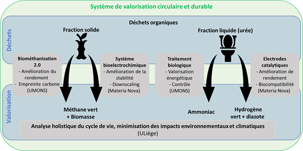Améliorer la valorisation énergétique des déchets organiques pour produire du biométhane et de l’hydrogène vert à partir de matières organiques fermentescibles et d'urine en développant de nouveaux matériaux d’électrodes, des systèmes bioélectrochimiques innovants et en réduisant l’impact environnemental global.