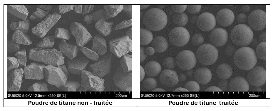 Des observations par microscopie électronique ont été réalisées sur des poudres de titane, avant et après un traitement par torche plasma. Ce traitement s'est avéré très efficace, entraînant un changement de forme radical des particules, qui sont passées de formes irrégulières à des sphères régulières.