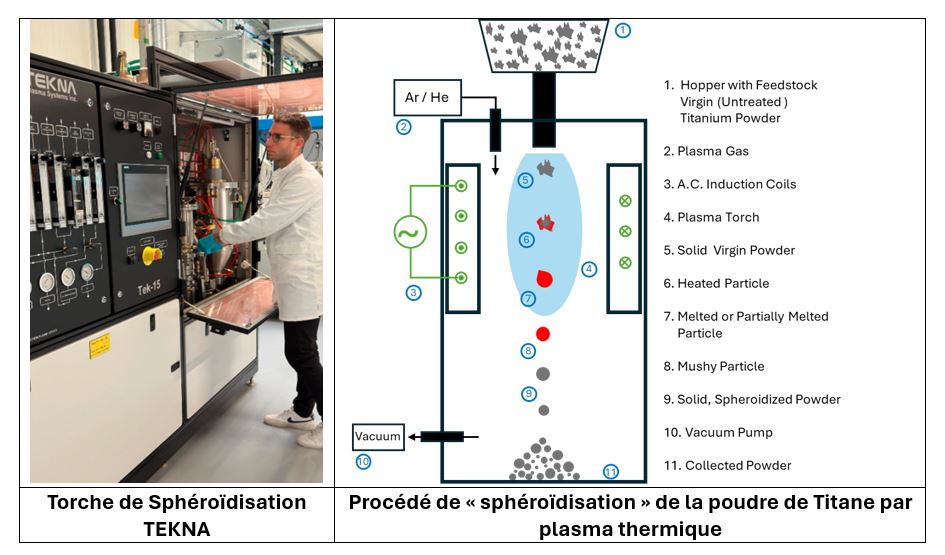 Afin d'améliorer les propriétés de ces poudres, une poudre de titane hydrogénée-déshydrogénée (HDH) a été sphéroïdisée à Materia Nova. Pour ce faire, une technologie de sphéroïdisation a été utilisée, en ayant recours à une torche à plasma radiofréquence (RF) acquises dans le programme REMADE (REcycled MAterials for aDvanced manufacturing tEchnologies", projet prioritaire du Plan de Relance de la Wallonie).