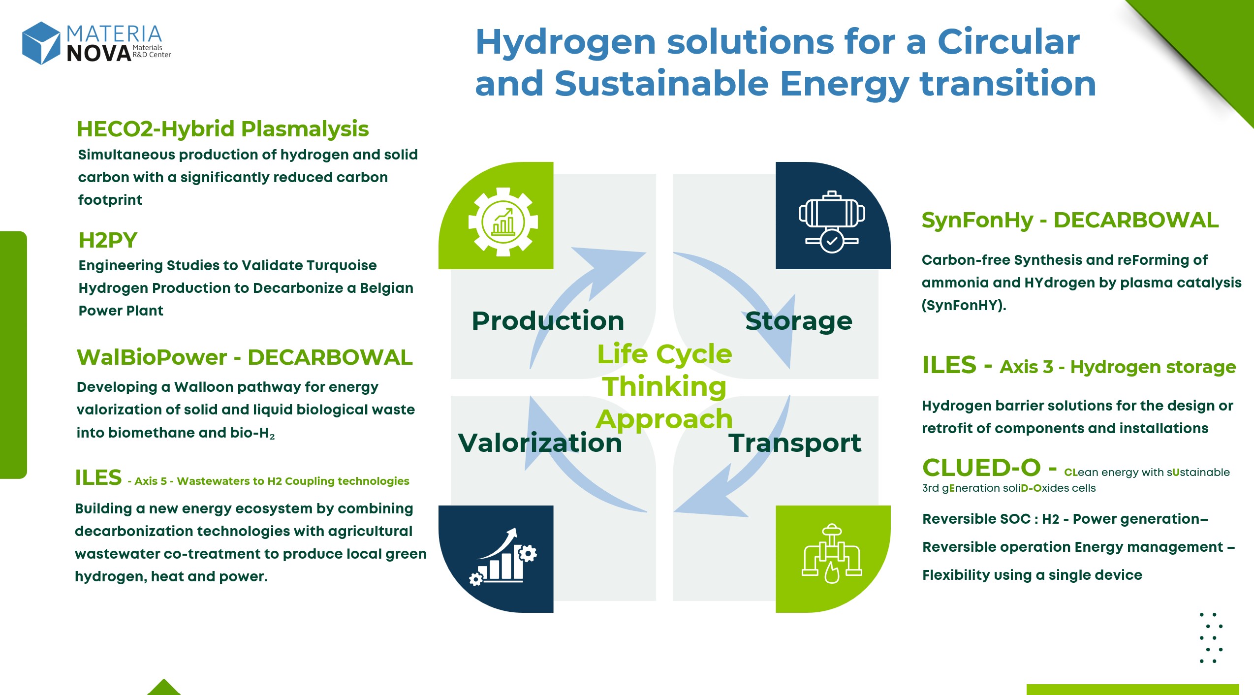 - Materia Nova investit depuis de nombreuses années dans la recherche et le développement de procédés propres pour la production d’hydrogène vert. En octobre 2020, elle dépose un brevet sur l’optimisation du procédé et de l’équipement de craquage du méthane (gaz de mine et biogaz) par procédé de PLASMALYSE HYBRIDE qui produit de l’hydrogène dit "turquoise" et du noir de carbone (CH4=> C + H2).