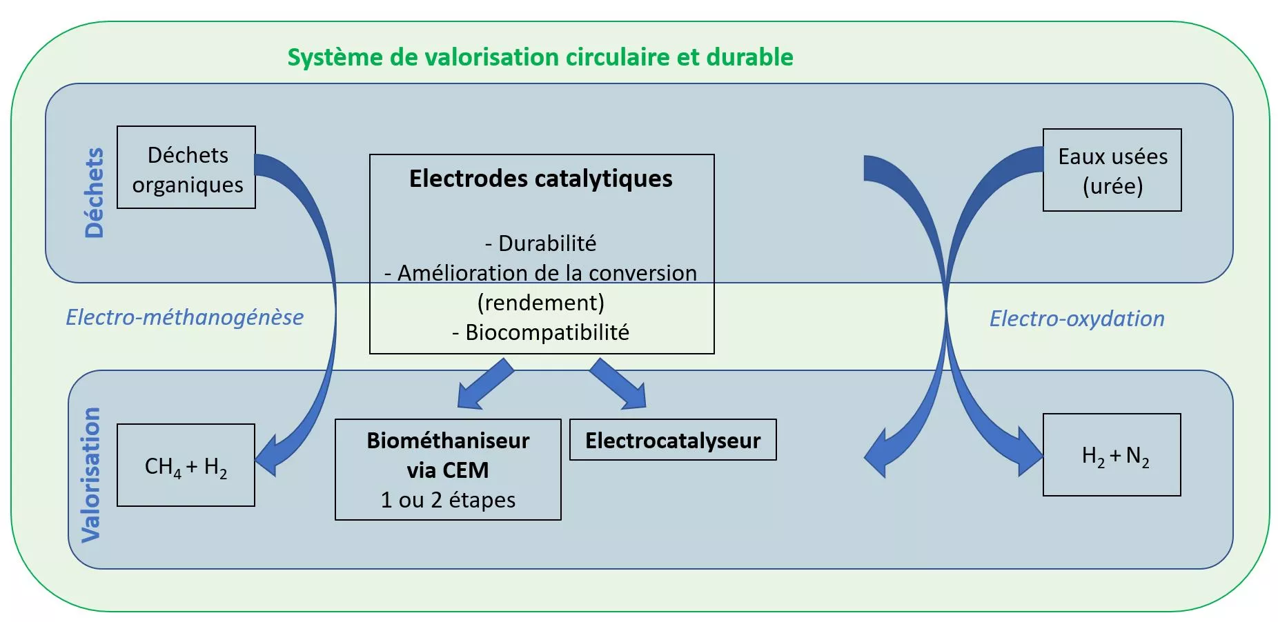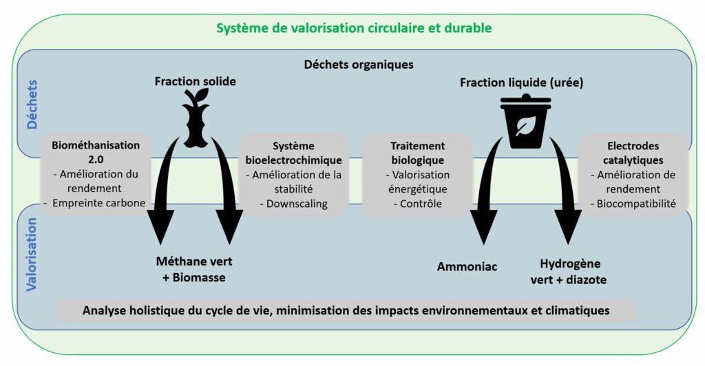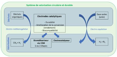 - Nos connaissances dans le domaine de la bio électrochimie et de la fonctionnalisation des électrodes et l’électrolyse pour supporter le développement de nouveaux matériaux d’électrodes pour l’électro-oxydation de l’urée et pour la biométhanisation assistée de CEM (cellules d’électrolyse microbienne),