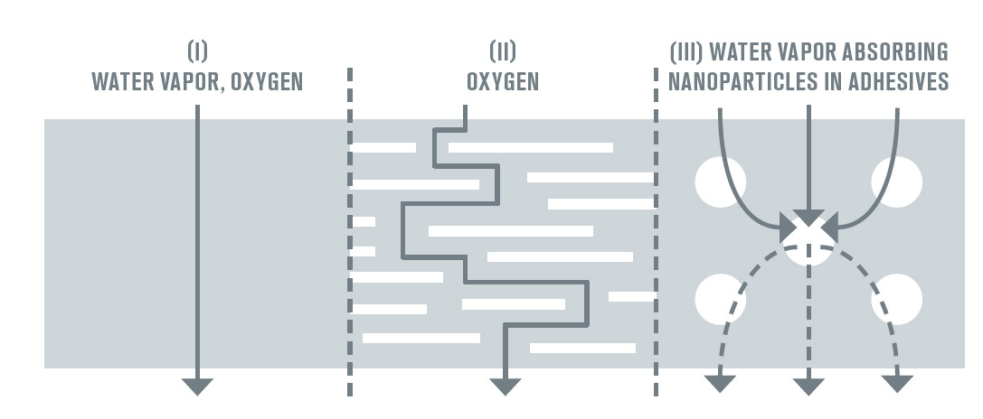- Approche multidisciplinaire associant des couches polymères additivées avec nanoparticules, getters et scavengers, des couches d'oxydes métalliques denses.